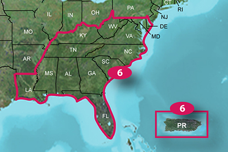 These are expanded regional maps that contain more states per region than the older Garmin map cards. Region 6 South East includes:Alabama, Delaware, Florida, Georgia, Kentucky, Louisiana, Maryland, Mississippi, North Carolina, Puerto Rico, South Carolina, Tennessee, Virginia and West Virginia.