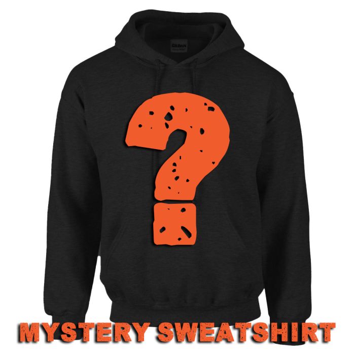 Select a size for a mystery sweatshirt. These sweatshirts could either have blemishes on the print or shirt (holes, poor stitching, peeling print, etc.), be overstock, or were misprinted for a custom order (ex. customer wanted the design on the back, but we printed it on the front).