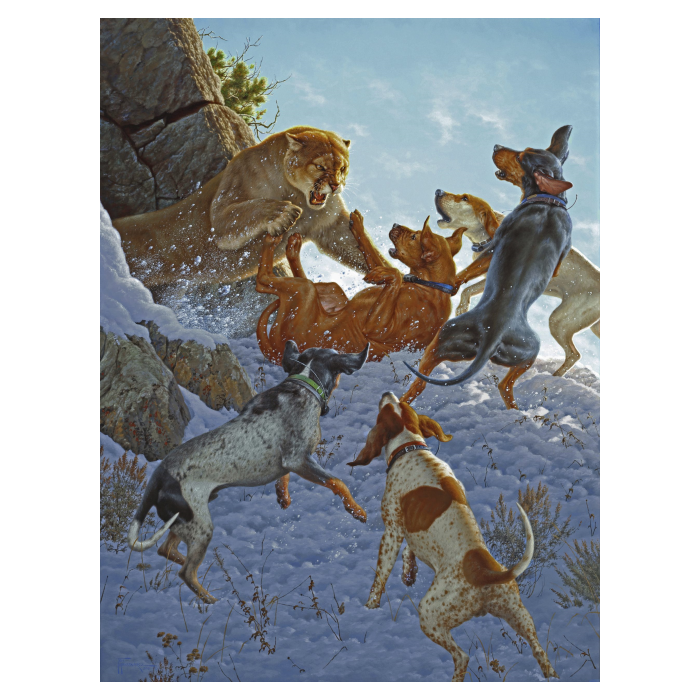 Feel the adrenaline of the chase with Boiling Point, an exhilarating hound hunting art piece by renowned houndsman Tom Mansanarez. This dynamic hunting dog artwork captures a heated confrontation between a fierce cougar and a determined pack of hounds, embodying the raw intensity of the hunt. With a lifetime of hound hunting experience in the rugged West, Tom infuses this hound hunting painting with vivid authenticity, showcasing the houndsā relentless spirit and the cougarās wild defiance. This canvas giclee is a bold tribute to the houndsmen heritage, perfect for hunters, collectors, and outdoor enthusiasts to display in their home or lodge. Explore more hunting dog art at DuSupply.com.